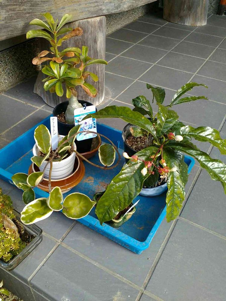 ぷっくりした茎の根元がかわいいアデニウム。白いお花が房で咲くクラリンドウ。ピンクの金平糖のような花ですサクララン。
