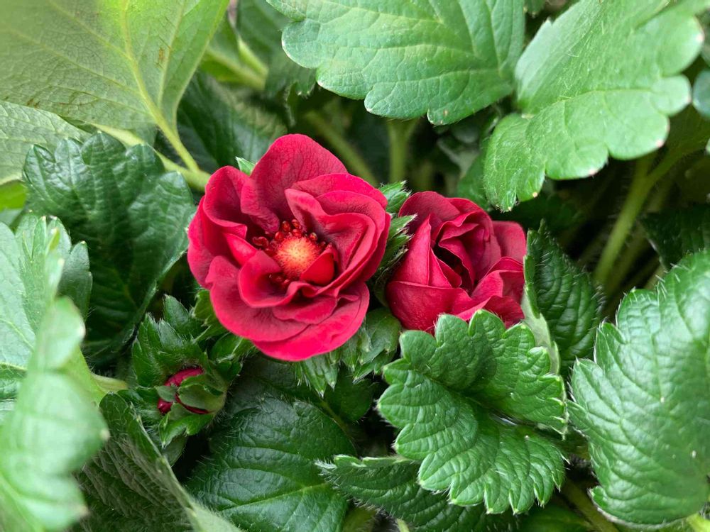 葉をかき分けたら、ローズベリーレッドにすごく立派な花が咲いてた!もう休眠だよね…取るべきかな?蕾もたくさん!