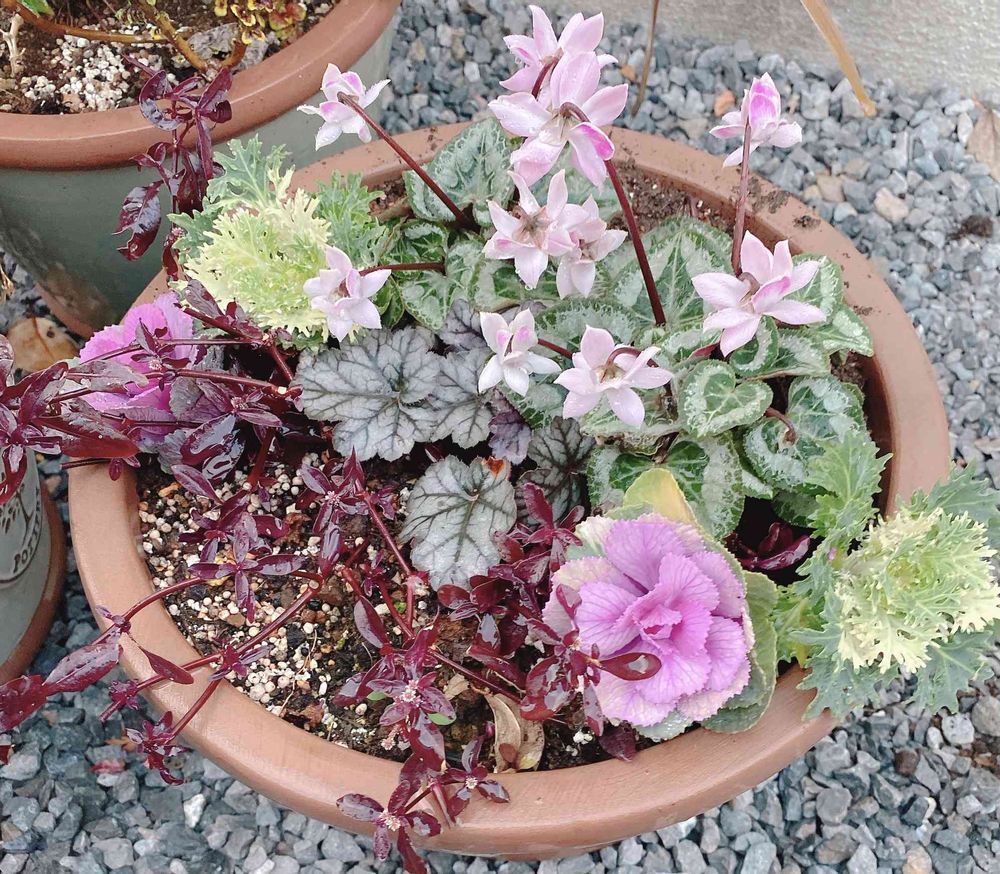 可愛いガーデンシクラメンが入ったので不思議な形の葉牡丹と植えたくて寄せ植えにしました🥰