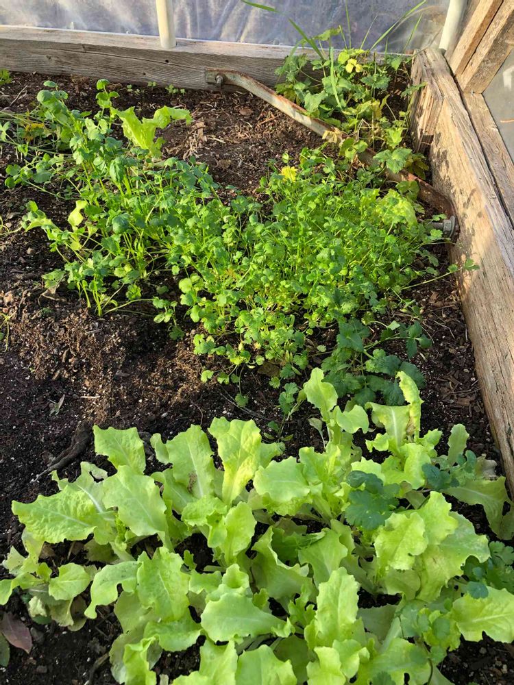 グリーンハウスに育つレタスとシラントロ。暖房入りではないので、これから氷点下の日が続くと枯れるのでそろそろ収穫しないと。