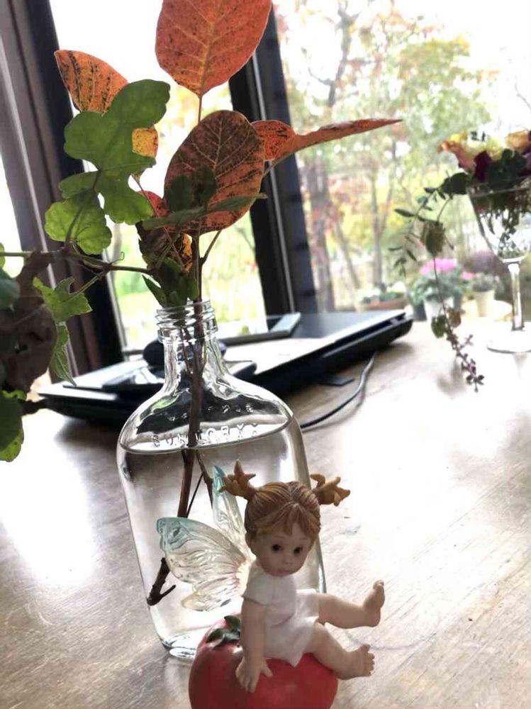 葉っぱを見たくて✂庭に出たとき、スモークツリーも綺麗なので、一緒に瓶に入れて眺めていました😀
