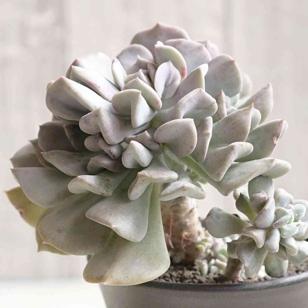 ライラックパープルの肉厚の葉っぱが内巻きにカールしているユニークなフォルムが目を引くハイブリッド。カリフォルニアの巨大農園 Altman Plants の Renee O'Connell さん作出で2011年生まれ。