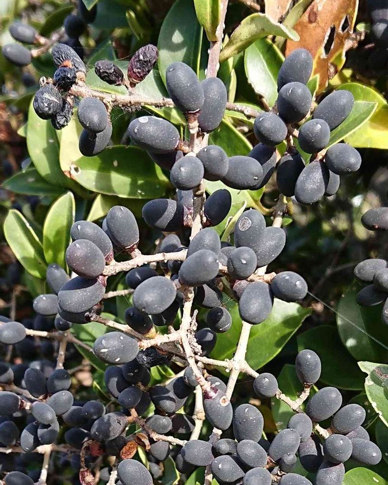 モクセイ科イボタノキ属の常緑小高木。名前からモチノキの仲間と思われがちだがモクセイの仲間。暖地の林に自生し、庭や公園にも植えられる。対生する葉は鋸歯がなく、厚く光沢がある。葉を揉むと甘い香りがする。花期は5~6月。枝先に花序を出し、先が4つに開いた白い花を多数咲かせる。果実は核果で長さ8~10㎜の楕円形。秋~冬に紫黒色に熟す。核は長楕円形。ヒヨドリなどの野鳥が旺盛に果実を食べ種子を散布する。