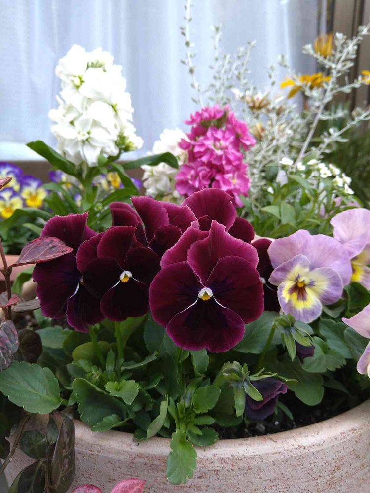 前に、投稿したパンジーわらくさんの寄せ植えが、花数増えてきました☘️💜☘️💜