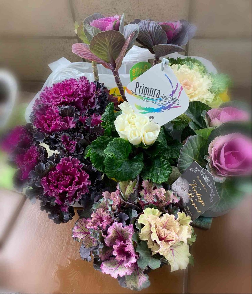 バルコニー/ベランダ,プリムラファンタジーホワイト,きりんの葉牡丹の投稿画像