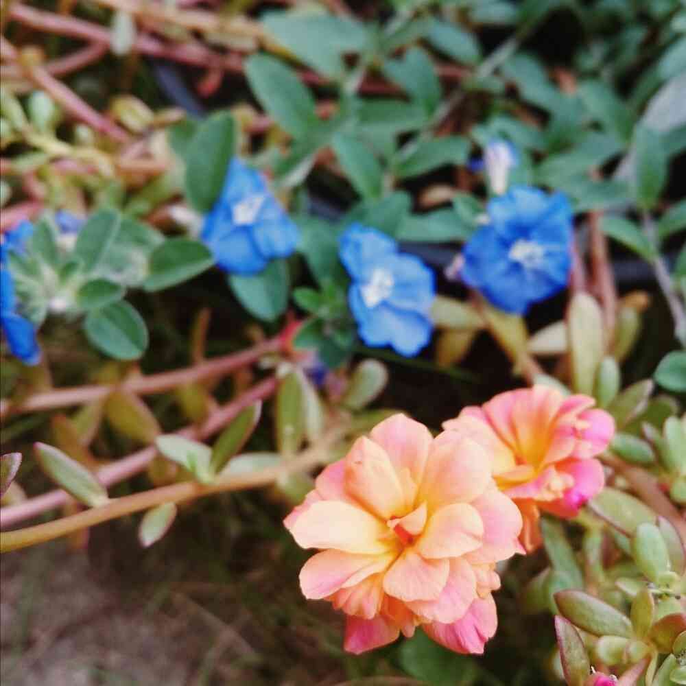 アメリカンブルーとポーチュラカ🌻夏に涼しい青と、元気が出るオレンジの色が1つの鉢に🌼