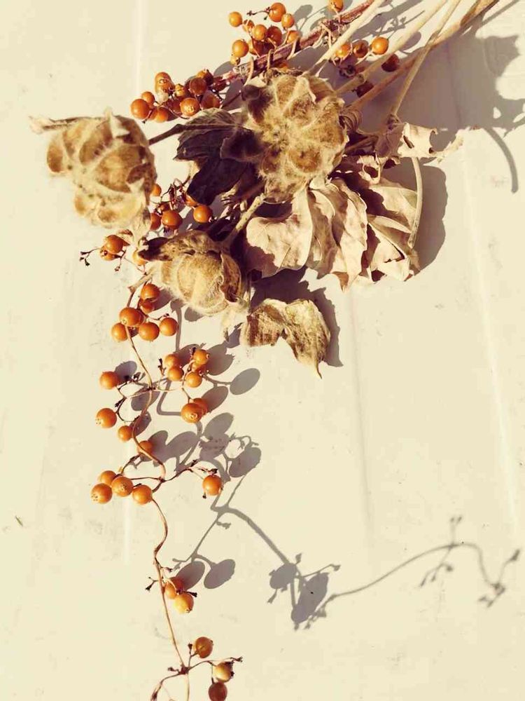 この間の実にフヨウの咲いた跡の花殻でアンティークブーケ風に☺️