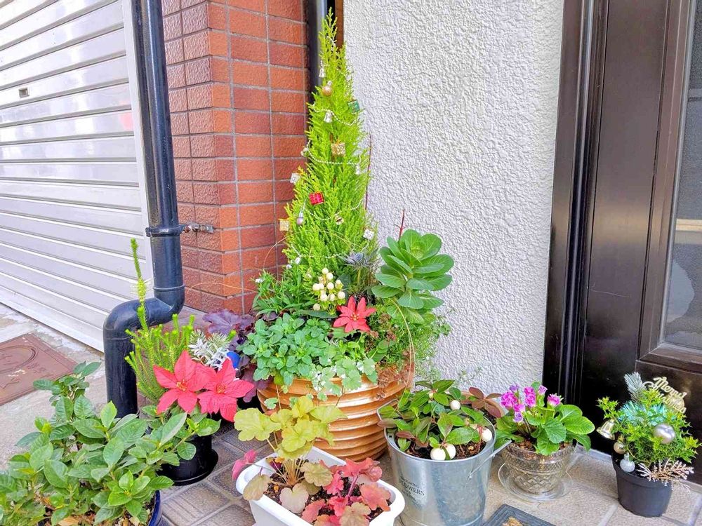 玄関先はイタズラ盗難があるので、安い苗、安い鉢、100均の飾りでゴチャゴチャした印象ですが、クリスマスなのでまぁ良いかな。