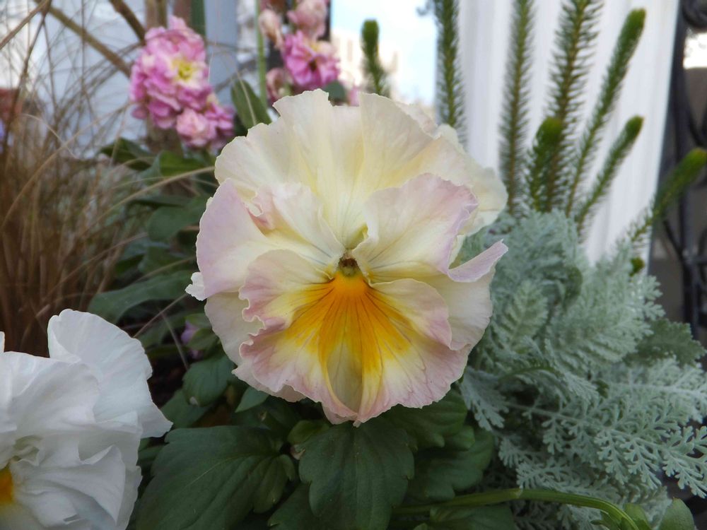 一重のパンジーは花びらが大きいためか花びら折れ曲がっているのが多いですが、このパンジーはフリルがあるので構造的に折れ曲がりにくいのかな・・・。😸