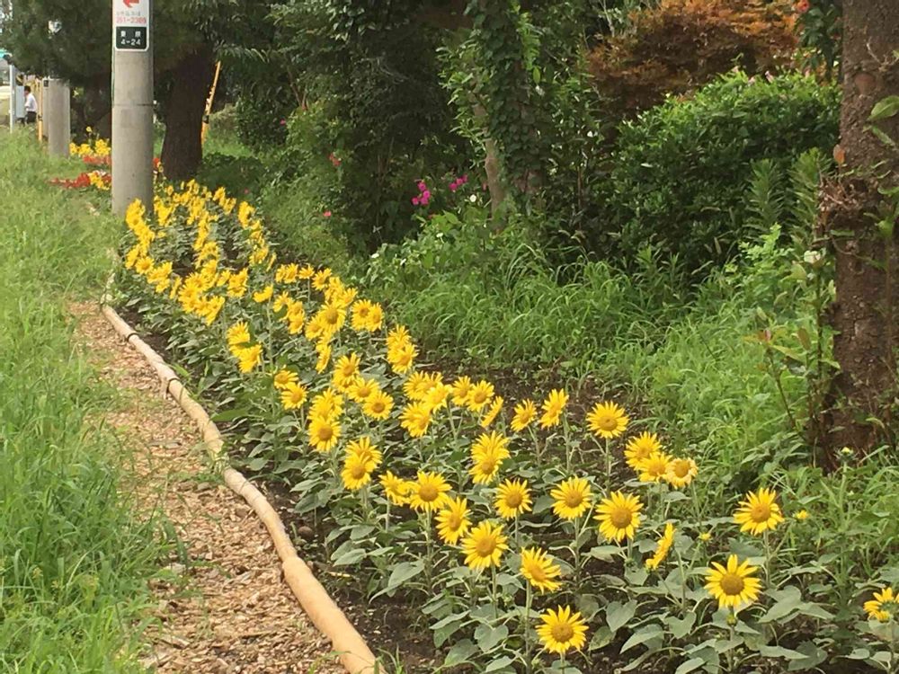 左手が車道右の植木の反対側が歩道。歩いている人からはひまわりはあまり見えません。あくまでドライバー向けです。