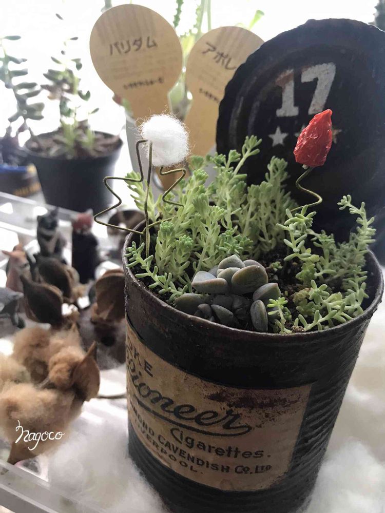 リメ缶は、渋いから、セダムのミドリがよく映えますね♪寄せ植えが上手くなったような錯覚になります♡