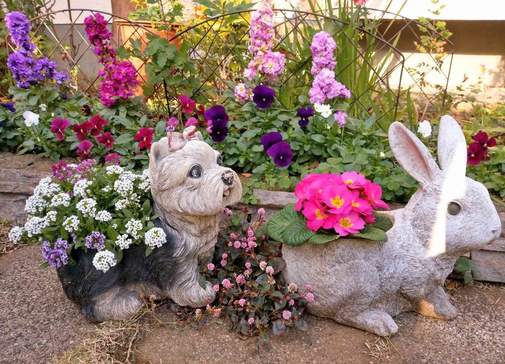 素敵な花壇、可愛い子が沢山咲いて華やかですね🌸🌼🌿🐶🐰も可愛い演出💗