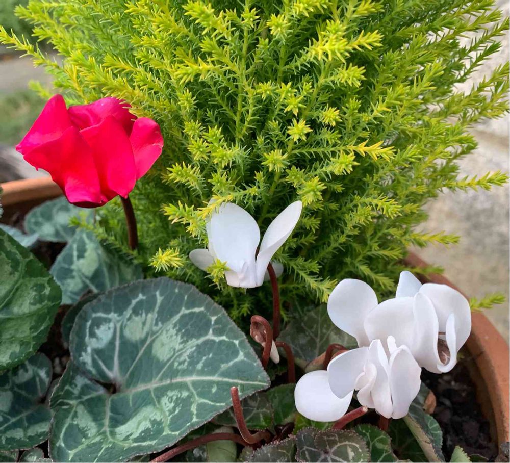 念願の白いシクラメンをゴールドクレストの鉢に植えてみた