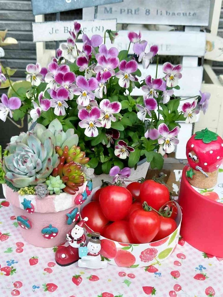 🍓トマトって、名前なの? ホント🍓のかたちしていて美味しそうだね😋 ビオラもいっぱい咲いて 可愛いね💕