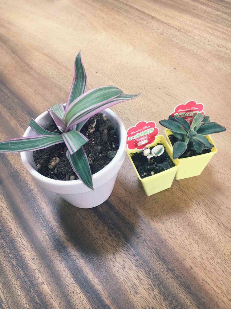 ダイソー購入品^_^ムラサキオモトは早速植え替えー!あとの多肉は真ん中、葉があんまりやったけど、班入りポーチュラカなんですかね?右は月兎耳に似てるけどちょっと違う?誰かわかりますか?😅