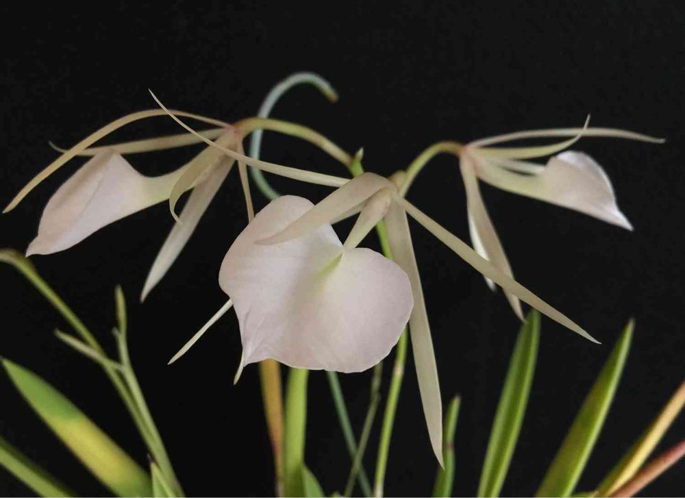 純白で、かすかに甘い香りを漂わせています。リップが大きくて、チョット唇を寄せたい気持ちになるような花です。