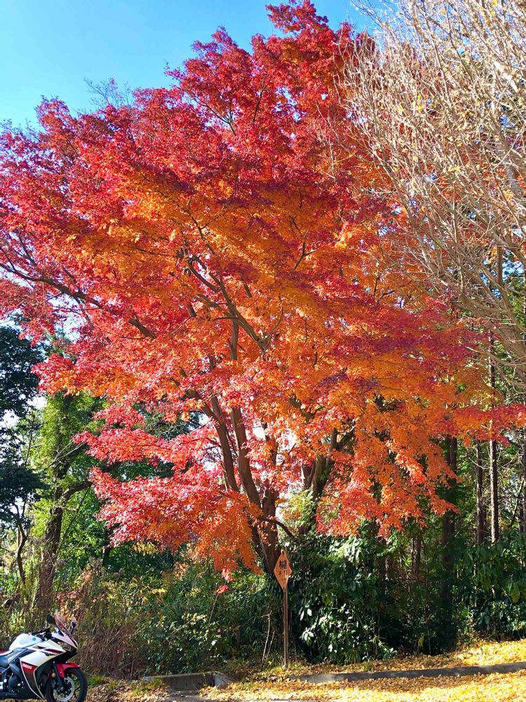 見事な紅葉🍁もありました。ソロライダーのバイクが一台🏍、私のじゃありません😅