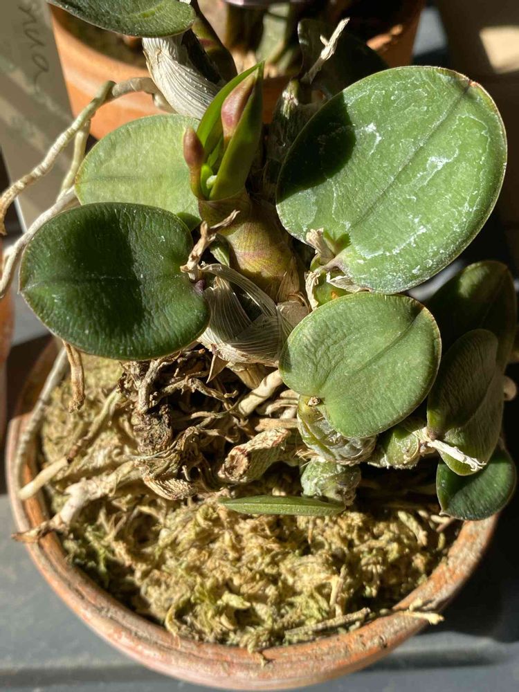 水が足りないです。生育期は腰水でも良いくらいです。葉に脱水の兆候が見えてるので、バルボや東南アジア系デンドロを育てるように水やりしてください。