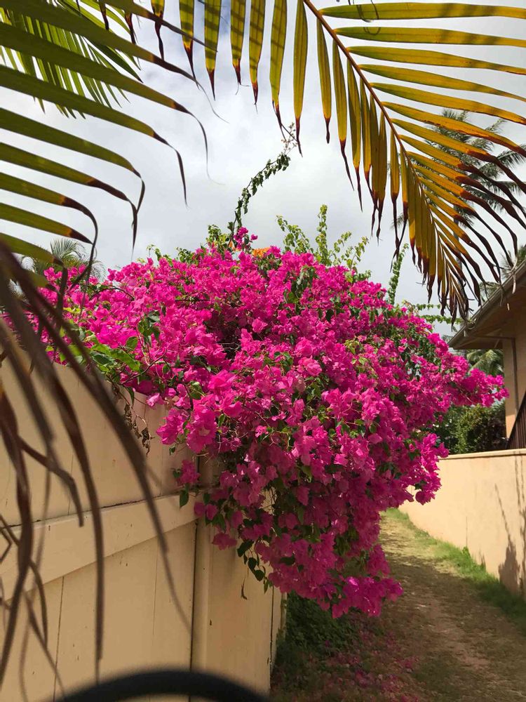 滞在していたオアフ島カイルア。海に続く小道にはブーゲンビリア。