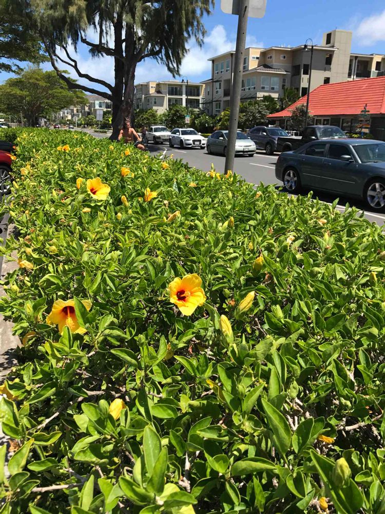 オアフ島カイルアで。ショッピングモールのパーキングも花でいっぱいでした。