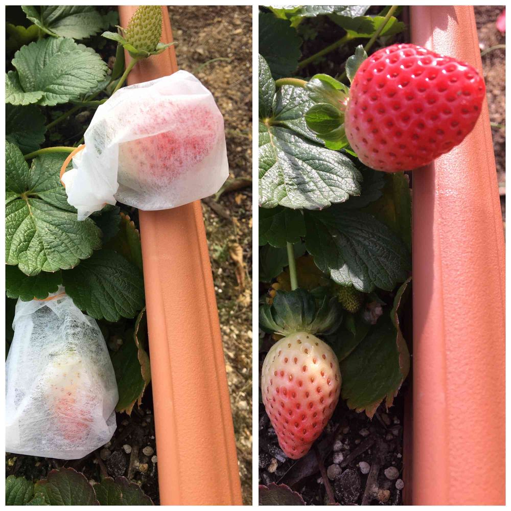 この前、ナメクジがかじっているところを目撃💦それ以来、赤くなったら、お茶の葉用の袋を被せています。大丈夫ですかねぇ。