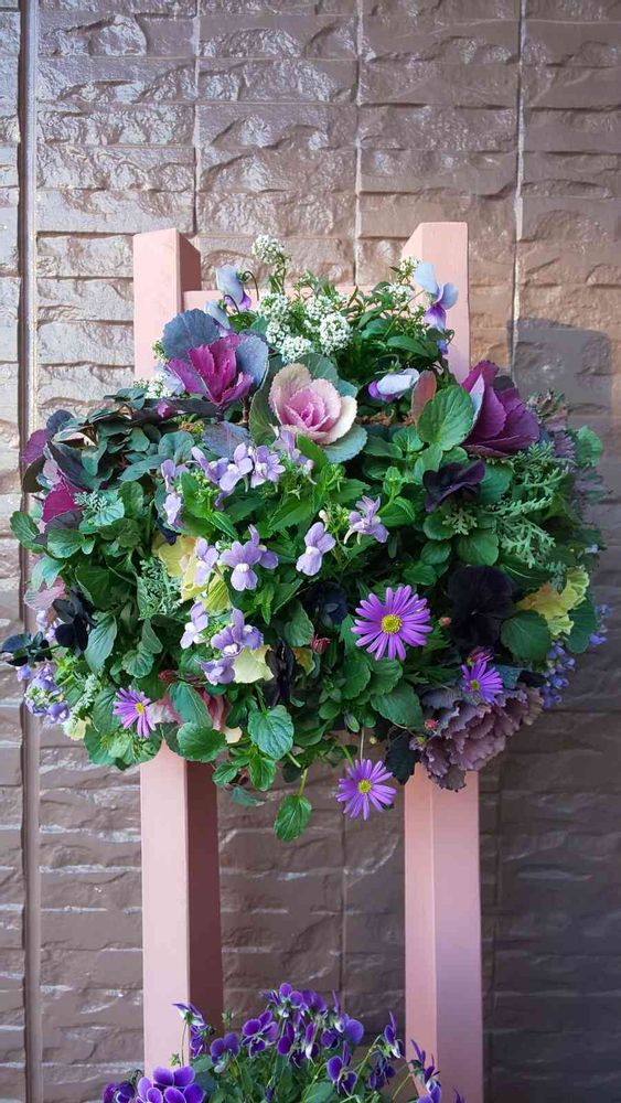 ナチュラルな感じが素敵なハンギングバスケットですね💕この時期にビオラやパンジーを使わないなんて新鮮です♬