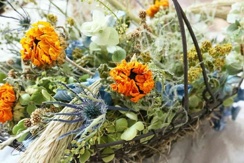 夏草バスケット。ドライフラワーの先生のレッスンで作りました。