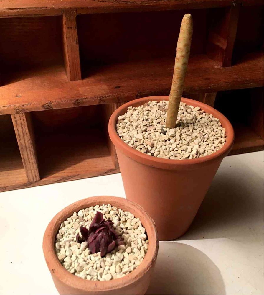 シュールですが、可愛いですね(^^)私は何故か黒法師は100%枯らしてしまいます・゚・(ノД`;)・゚・斑入りってすごいですね!新芽楽しみです♡