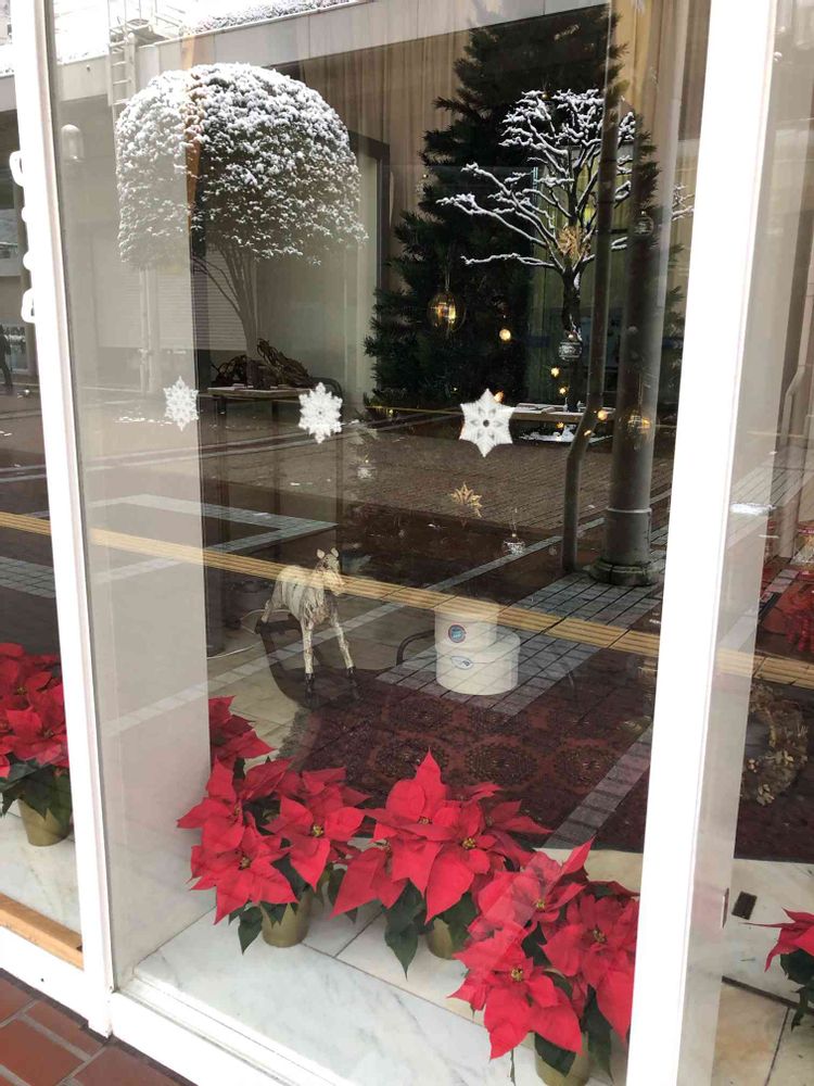 ショーウィンドの中にポインセチア🌺と🌲 窓に雪化粧した木々が写り可愛い