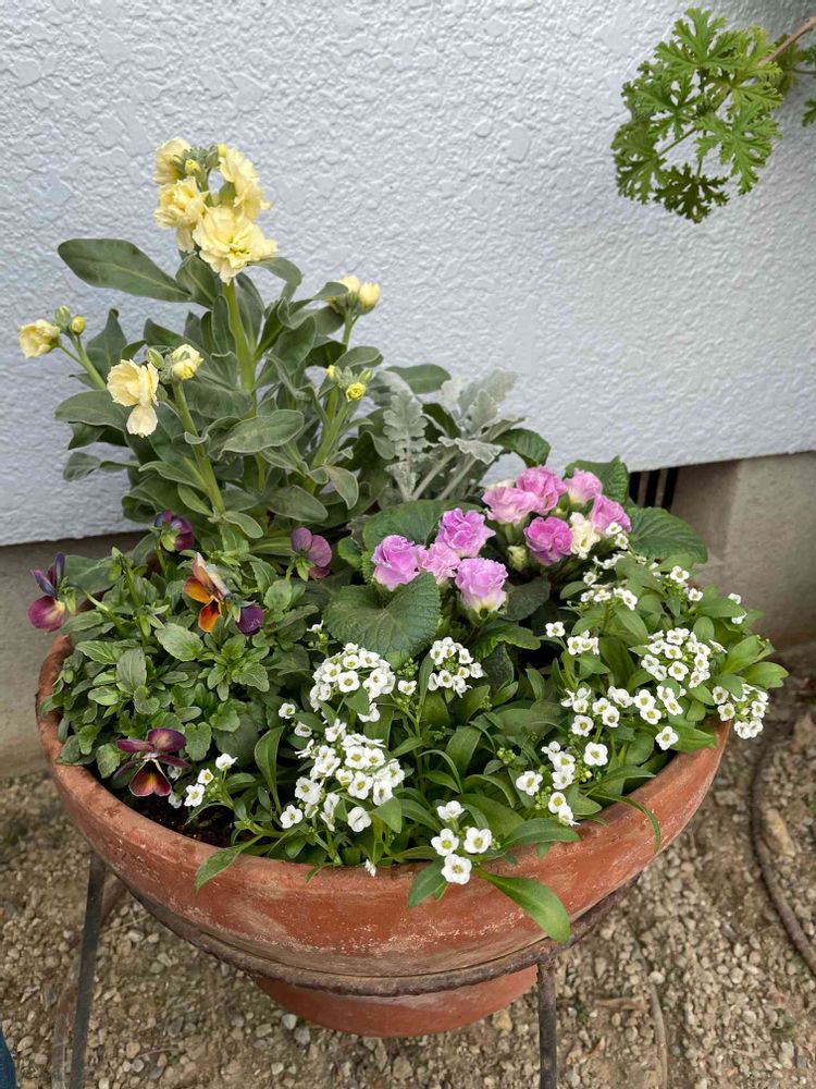 花屋で見かけたバラ咲きジュリアンが可愛くて、週末に寄せ植えにチャレンジしてみました。こんな感じの寄せ植えは初めてなので、これからもっと勉強したいです☺️