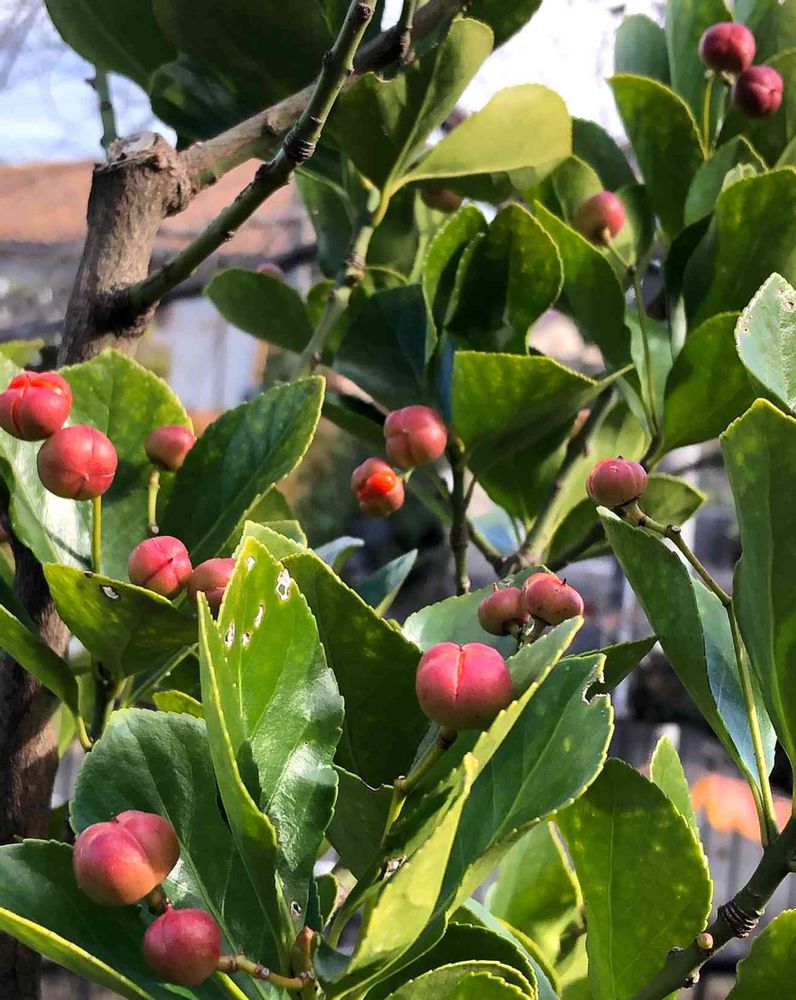 マサキ:別に派手さもない樹ですが、年中元気な葉っぱ・プックリの真っ赤な実・春にいっぱい咲くちっちゃい白い花など 年々愛おしさが増してきます👀💕💕💕