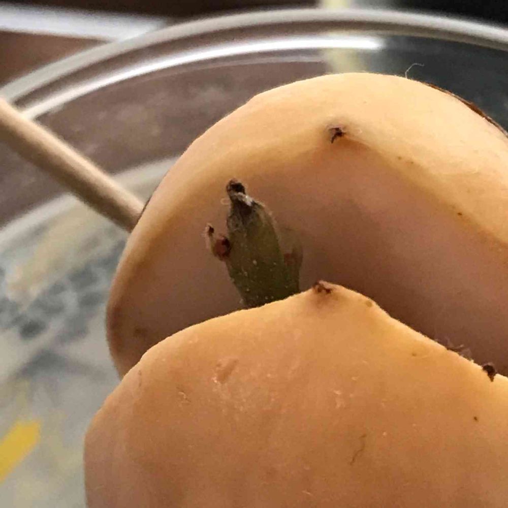 アボカドの水耕栽培で発芽しましたが、先端がこんな状態で、ここから伸びて来ません😭 太い根から細い根が出始めています。 この子の芽、どうしてあげるべきでしょうか?