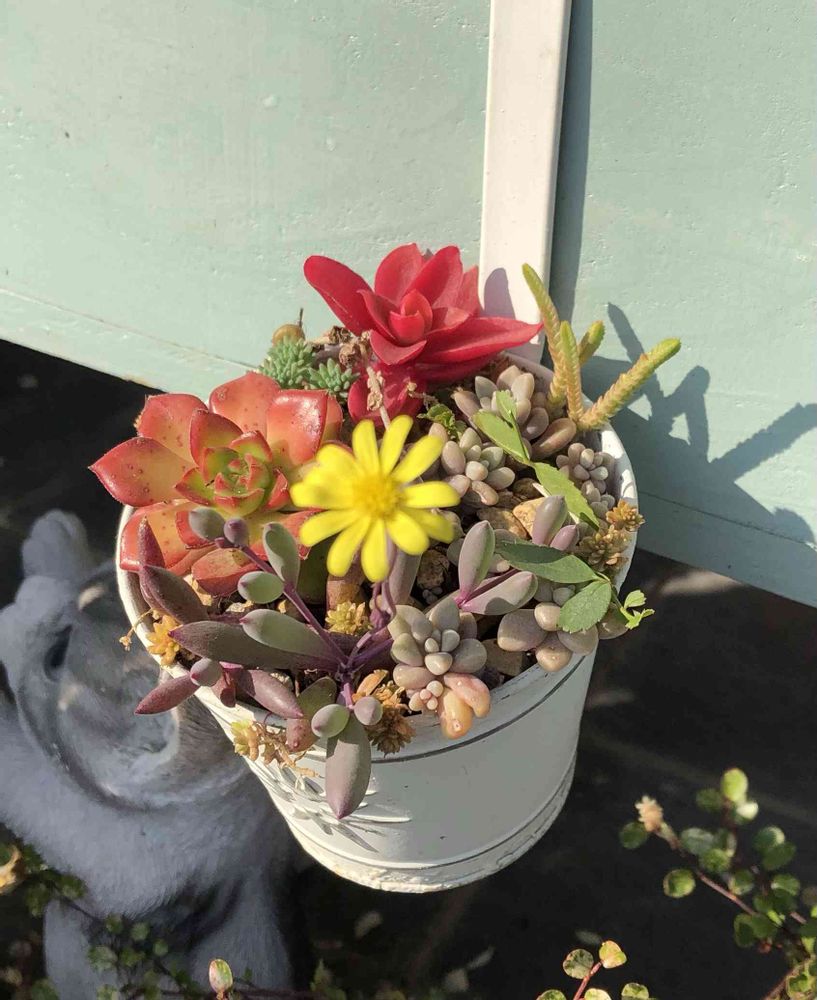 高級なエケベリアをたくさん使って寄せ植えができたらいいのですが、私の寄せ植えはポイポイ鉢からの寄せ集めなので地味なんですよ😅