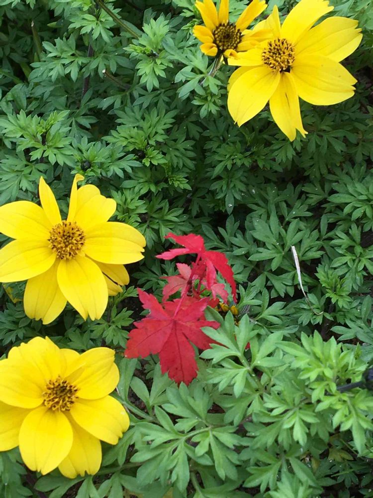 小さな 小さな楓が、ビデンスの中に根を下ろして 紅葉🍁しています。