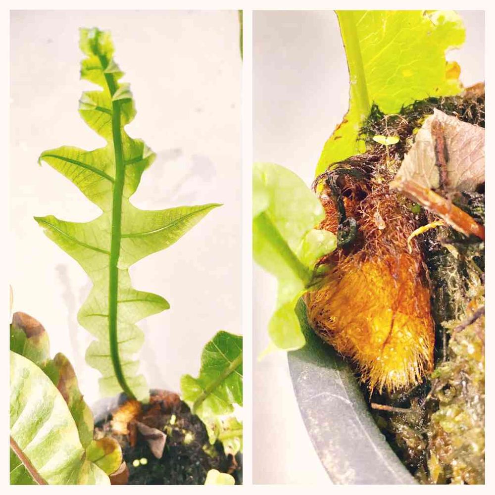 本当は成長した株を見せれると良かったのですが。カザリシダまたはアグラオモルファで検索すると変わった葉っぱの立派な成長した姿が拝めます。成長した茎元はビカクシダに似てますね。かなり大きなシダになります。