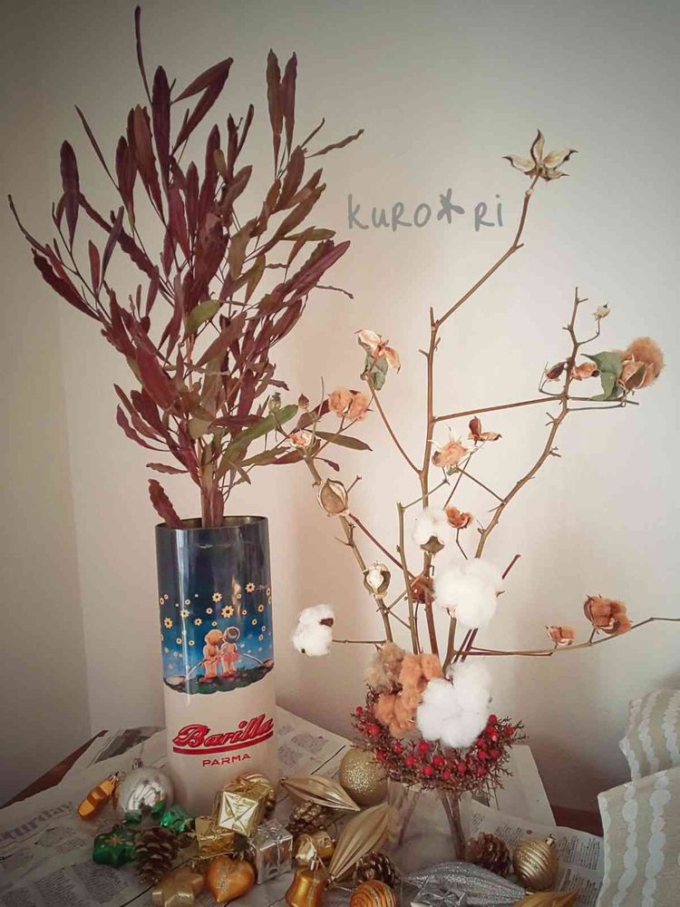 紅葉してるドドナエアを微妙に季節外れの🤣缶に挿し今年育てたコットンの枝も飾りました🎶南天で作ったリースをネックレスにして❤️