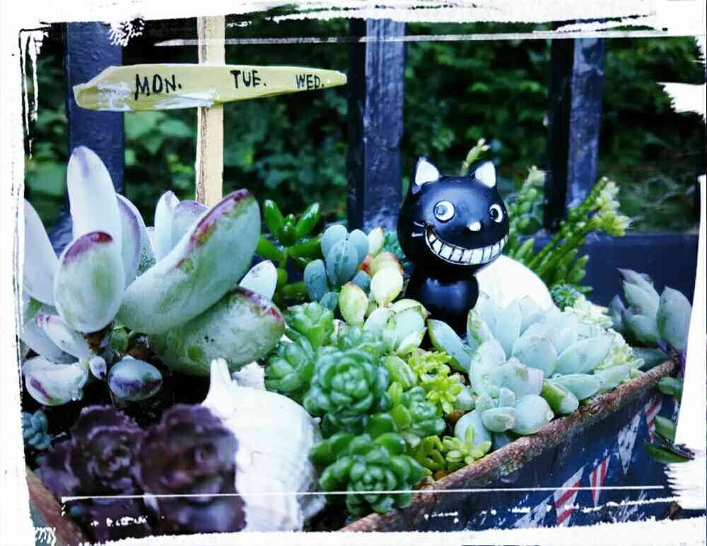 久しぶりに、好きな(=^ェ^=)ちゃん交え、多肉寄せ植え箱庭🌵作りました~(*´∀`)♪