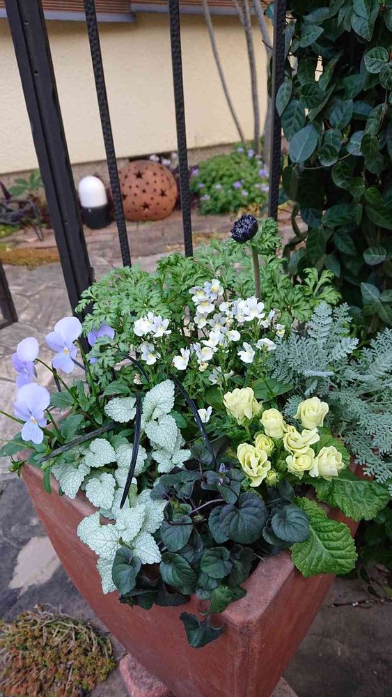 以前投稿の寄せ植え、やっぱりレモンイエローが入った方が柔らかな印象になるかなぁと思い、仕立て直しちゃいました😊