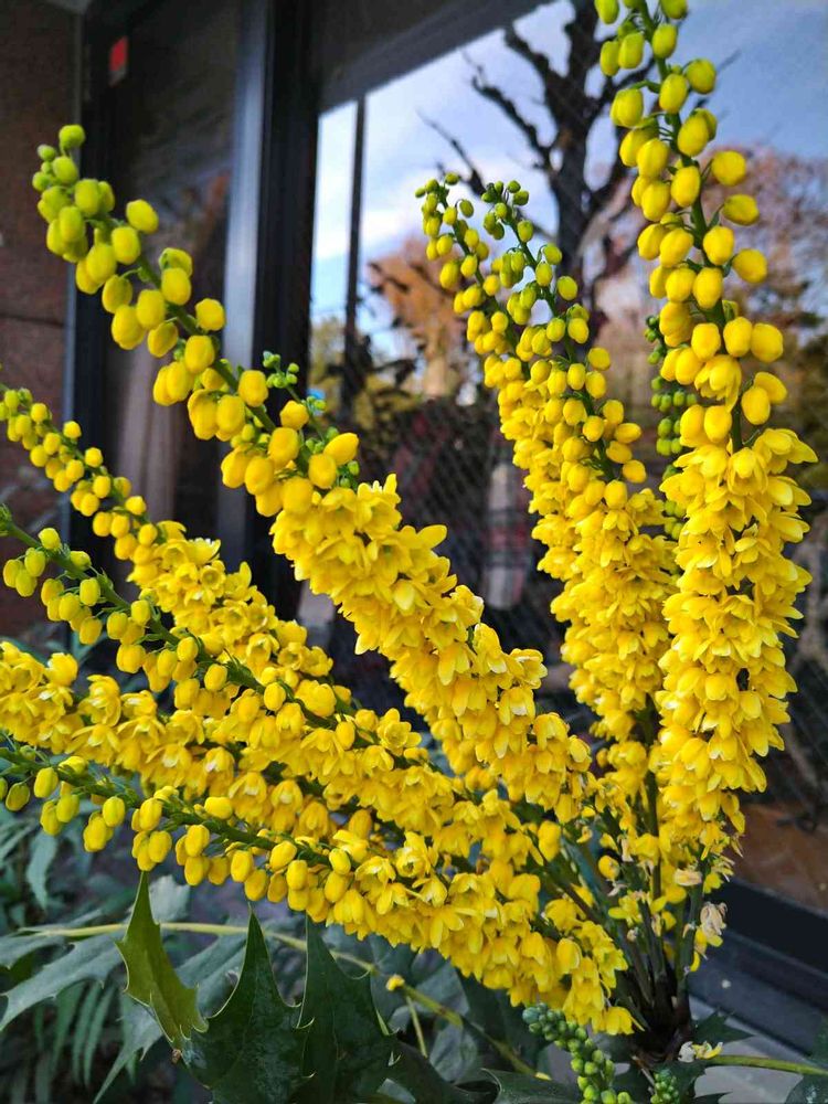 ヒイラギナンテン属の💛マホニア・チャリティー💛の鮮やかな黄色い小花を多数つけた細長い花穂が上向きに伸びた豪華な綺麗なお花を、今年も見ることができました🤗💗