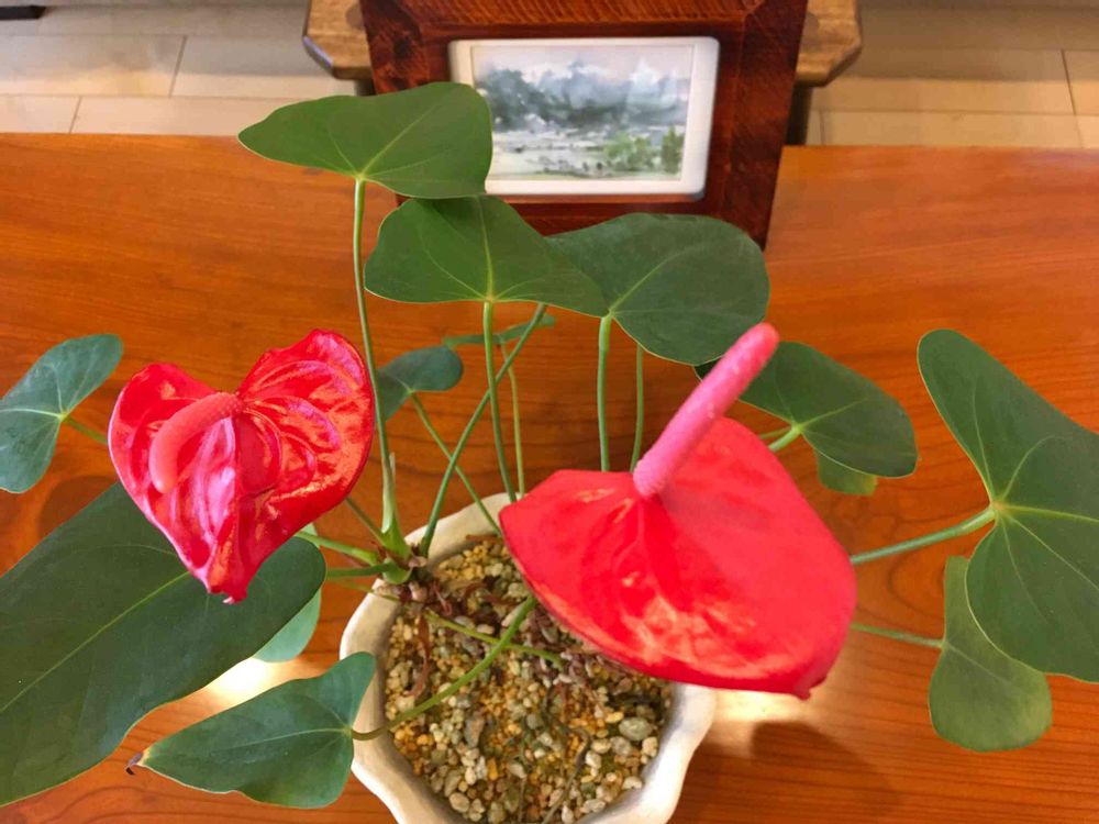 アンスリュームの赤いハート♥️の花に癒されています💞
