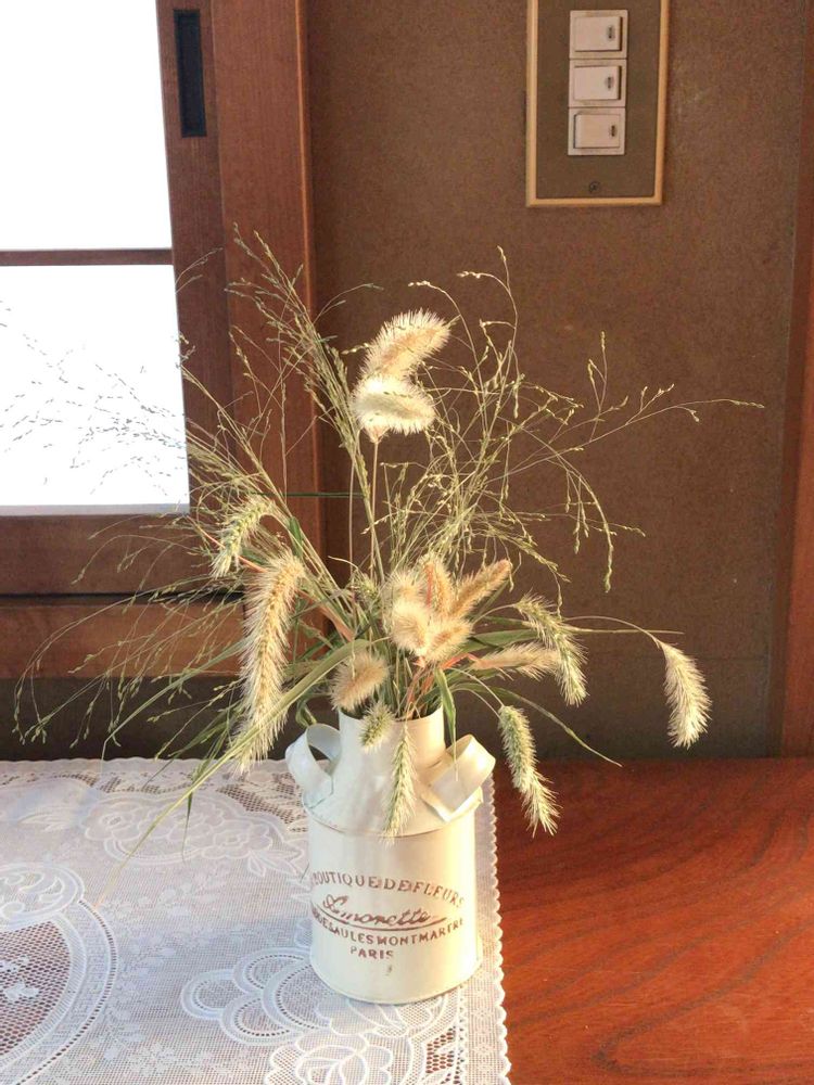 エノコログサは水のない瓶に入れておくだけでドライになってくれるので、夏から時々小さな穂を見つけると採っていれときました。