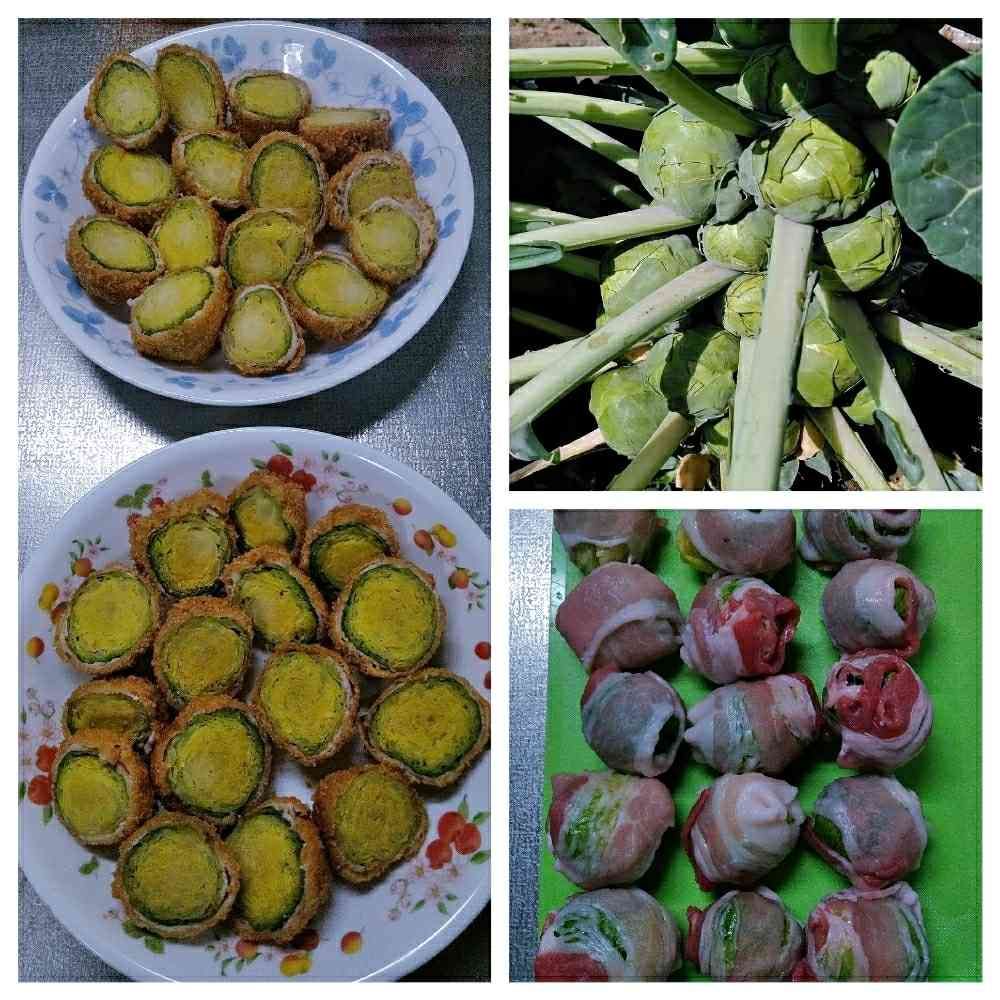 畑の芽キャベツです~。小さなキャベツがたくさん出来てる。肉で巻いて、フライにしました~。半分に割ってみると、芽キャベツの中は黄色で、黄身の大きなゆでタマゴみたい。いろんな味のドレッシングをかけて、うんまい~。