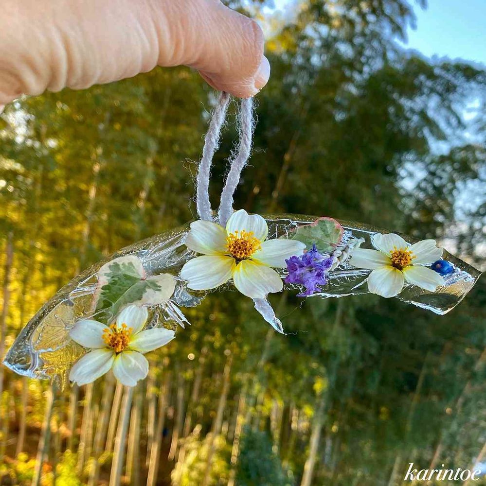 昨日、娘たちとゼリー型に水を入れて、ベランダのウインターコスモスやラベンダーなどの花を浮かべ、一夜待ちました。