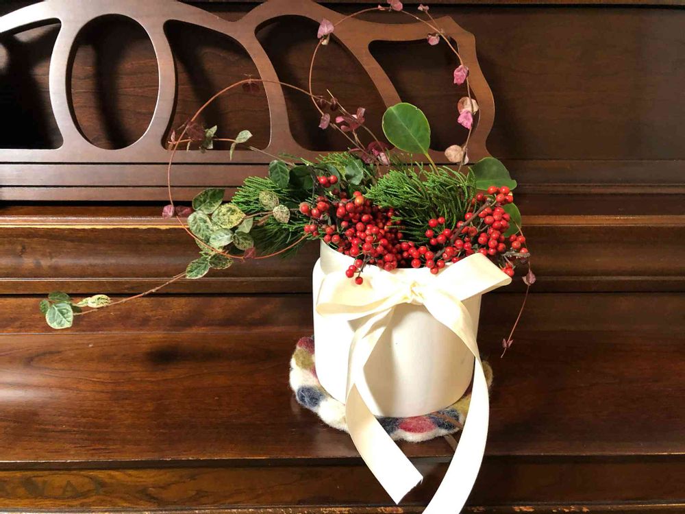 選定でザクザク切られたクロガネの木の赤い実と飾ってみたりしています。