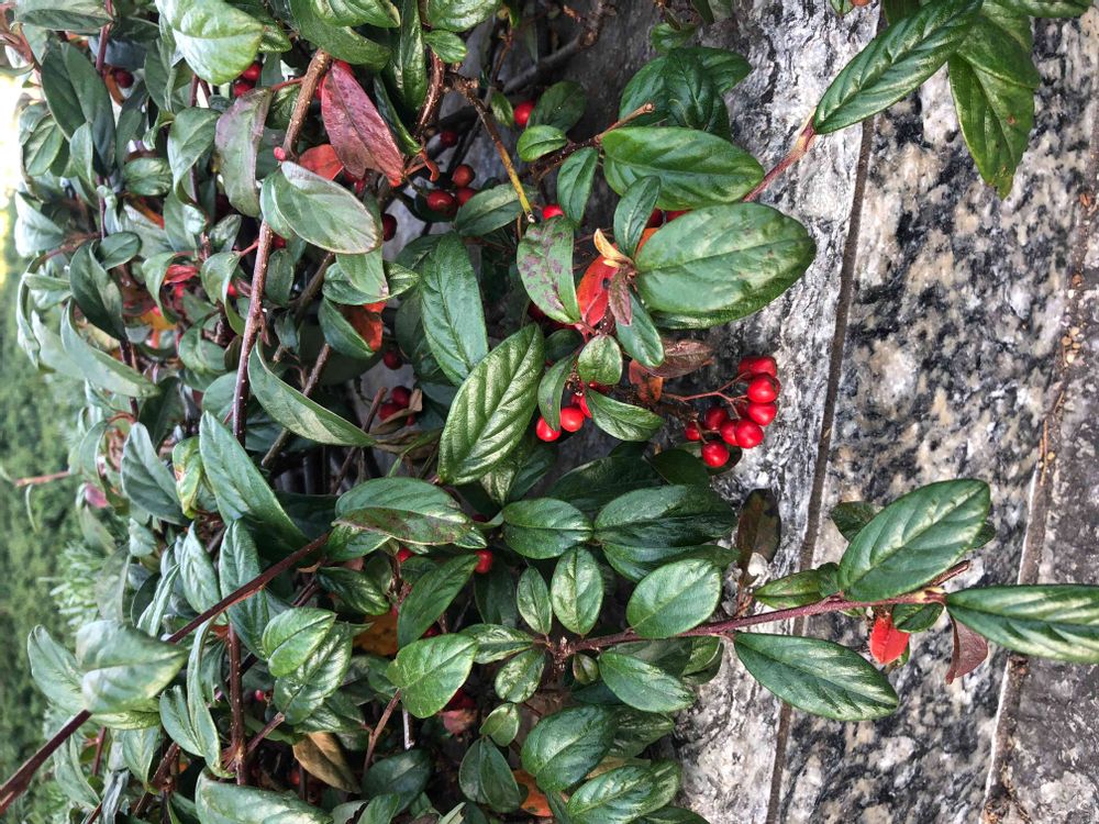 この実 低く這う、葉っぱのギザギザがない、実の付き方などからコトネアスターで正解だと思います!