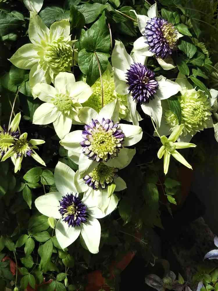 クレマチス・テッセンとクレマチス・シロマンエの組み合わせですね。シロマンエは、テッセンから派生したものです。