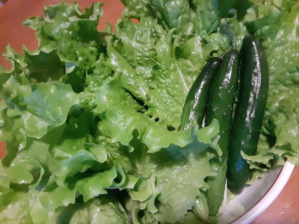 種から育てたサニーレタスときゅうり!手作り温室で育てました👍こちらも採れたて美味しかったです😊