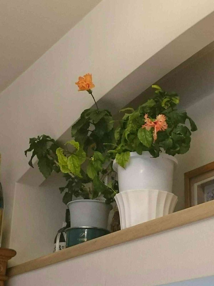 飾り棚のハイビスカス オレンジフラミンゴと、風鈴仏桑華が咲きました。