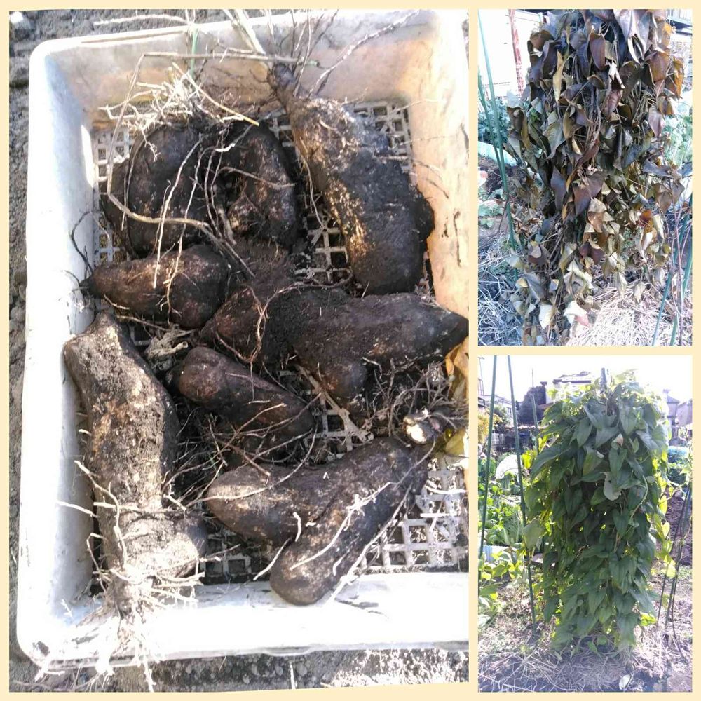 右⤴️葉🥬が霜で一気にふにゃふにゃになった😱右⤵️2日前迄は元気だった葉💚たった1個の種芋から今日の収穫💯💓笑いが止まらない⭕🤣🤣