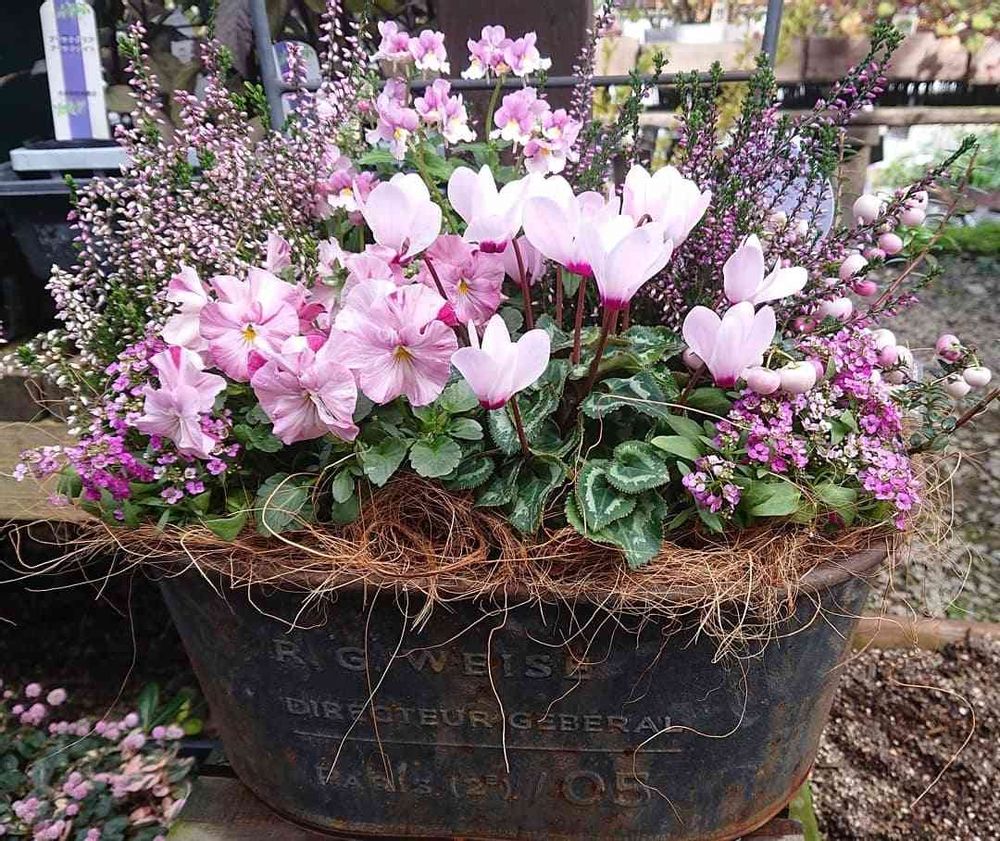軽井沢育ちガーデンシクラメン“ジャドール”、神戸べっぴんさん“乙女ごころ”、宿根ネメシア“マリーピンク”、カルーナ“ガーデンガールズ”、ペルネッティア“ハッピーベリー”、アイスクリッサム“ストロベリー”です。